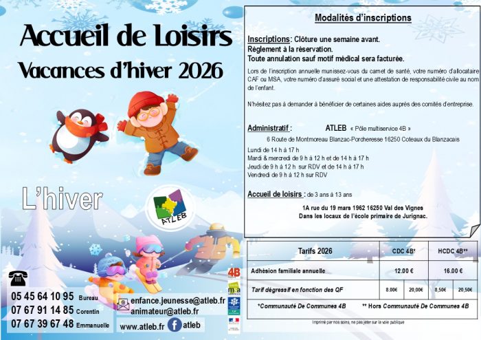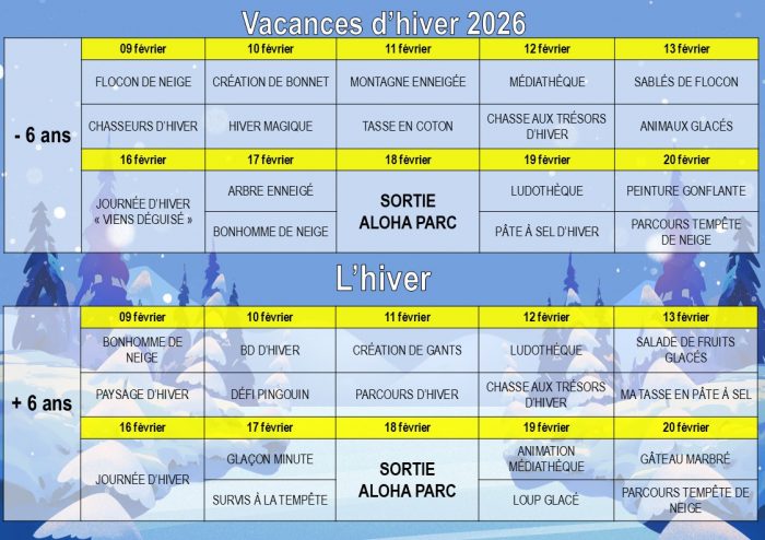 Programme ALSH/CLADOS vacances février 2026 Posted onjanvier 13, 2026janvier 13, 2026Laisser un commentaire